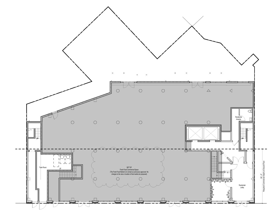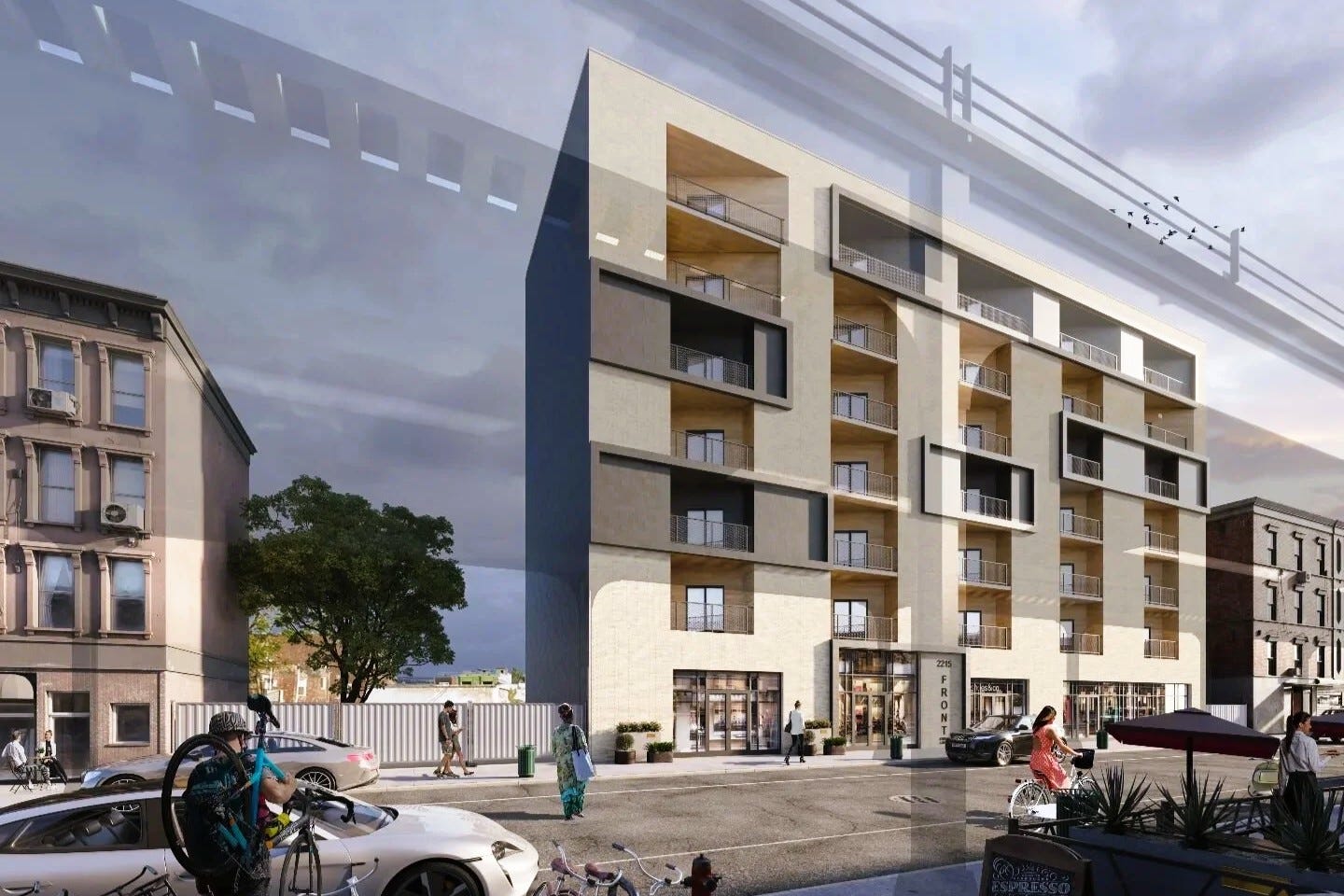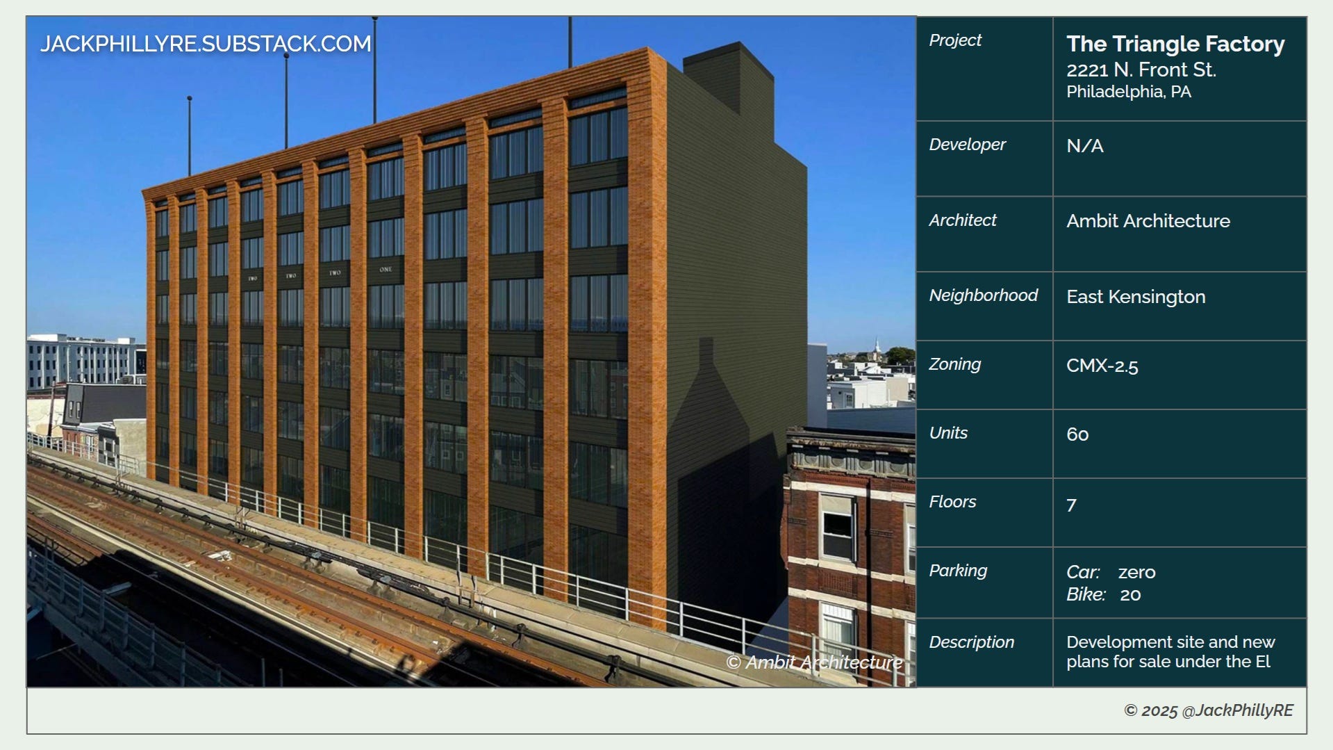 And then earlier today, a brand-new listing from GREA provided us with an update from out of the blue: the property and the plans for thsoe 60 units are now for sale for $1.725 million. The specs for what can be built here have remained mostly the same, though the renderings of what is now called The Triangle Factory show a more traditional brick look topped with a cornice. The zoning permits also give us some additional information, showing the new design is from Ambit Architecture, 20 bike parking spaces are included, and height/density boosts are utilized thanks to the mixed-income and fresh food bonuses - meaning we could see a grocer here on the ground floor eventually. This zoning permit is still good through March 2026, making this an appealing property for a potential buyer who wants to hit the ground running.