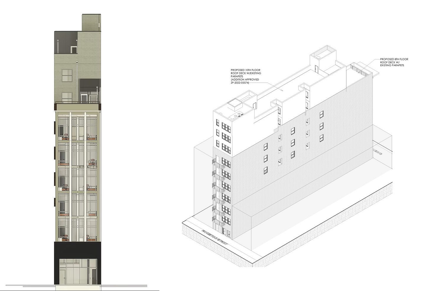 But, as you probably have guessed, we have plenty of new information, thanks to an upcoming trip to the Zoning Board of Adjustments (ZBA). A little background first: these high-level plans from a few years ago come to us from Parallel Architecture Studio, but it seems as if the building has new ownership, with records listing DO Holdings as the owner for the last several years. The zoning permits and DO Holding’s post both indicate a hotel proposal, with a trip to Parallel’s website specifying that a 37-room Sonder is the planned size and hotel operator, respectively. We also noticed a rendering that was new to us, giving us a better picture of what’s coming when paired with an old massing drawing. It looks like some facade changes are perhaps planned, though any exterior adjustments would need Historical Commission approval given the protected status.