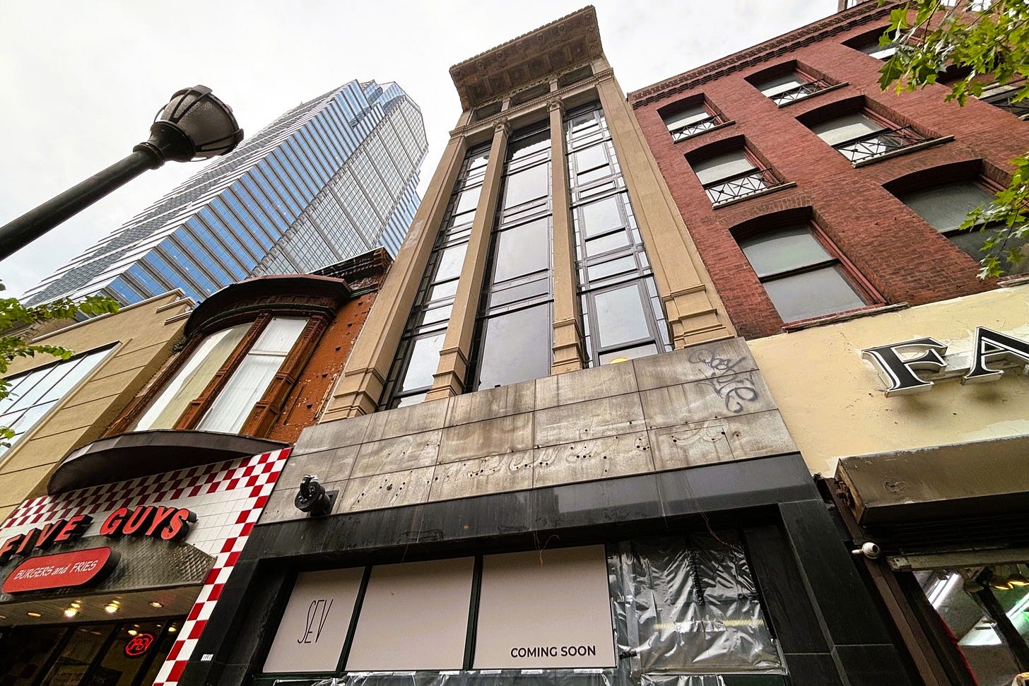 Since then, the building has been in something of a state of flux, with plans coming and going (per yours truly in my old gig), though the building looks roughly the same as it did upon receiving its historical status. There were some hints that an update could be coming, with zoning permits back in 2022 and some facade work last year, though it was difficult to pin much down beyond a potential addition/hotel concept. There weren’t many other details that could be gleaned from a recent marketing pamphlet for the commercial space, leaving us somewhat in the dark around what the future might hold here.