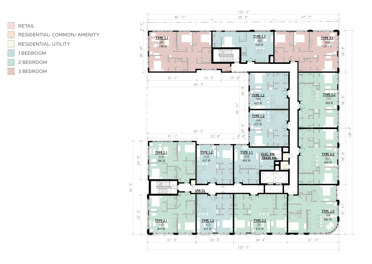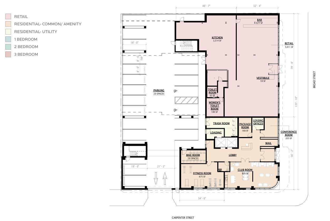 This email informed us of an upcoming zoning meeting on August 20th for a seven-story, 84-unit project. Ground-floor retail and parking for 20 cars/28 bikes are also part of the plans, with this project proceeding by right thanks to the CMX-3 zoning. The 5,000 sqft retail space will take up the northern part of the footprint, with the plans showing both a kitchen and a bar - seemingly teeing up a future restaurant. A lobby, club room, and fitness space will make up most of the remainder of the ground level, with parking access along the less busy Carpenter St. to the south. Units will consist of one-, two-, and three-bedroom spaces, offering a nice variety of options beyond what we often see today in new construction.