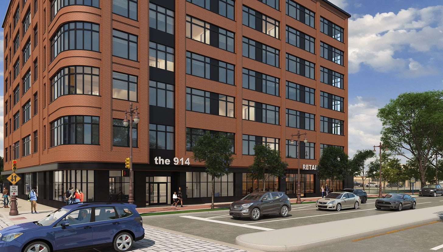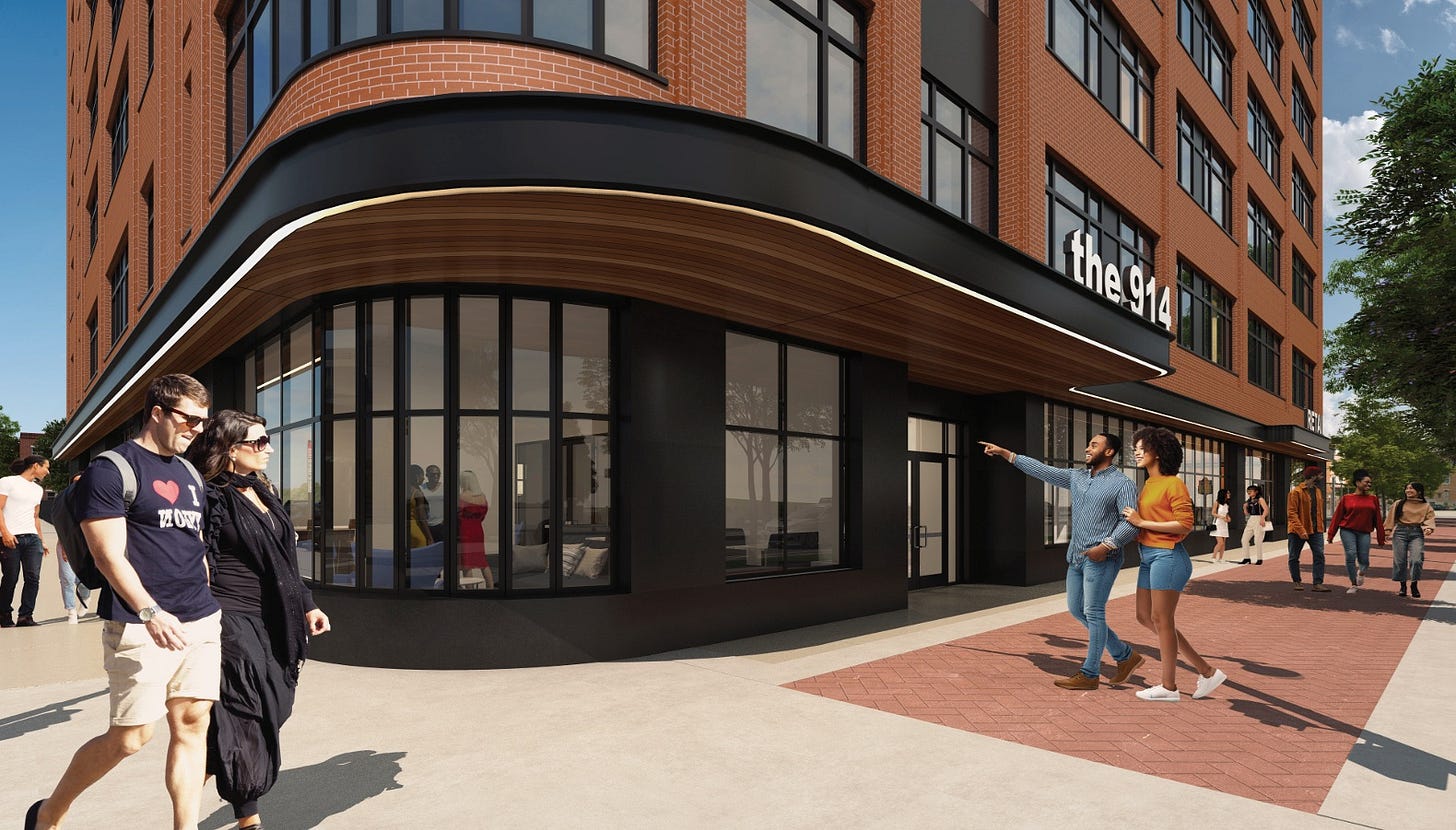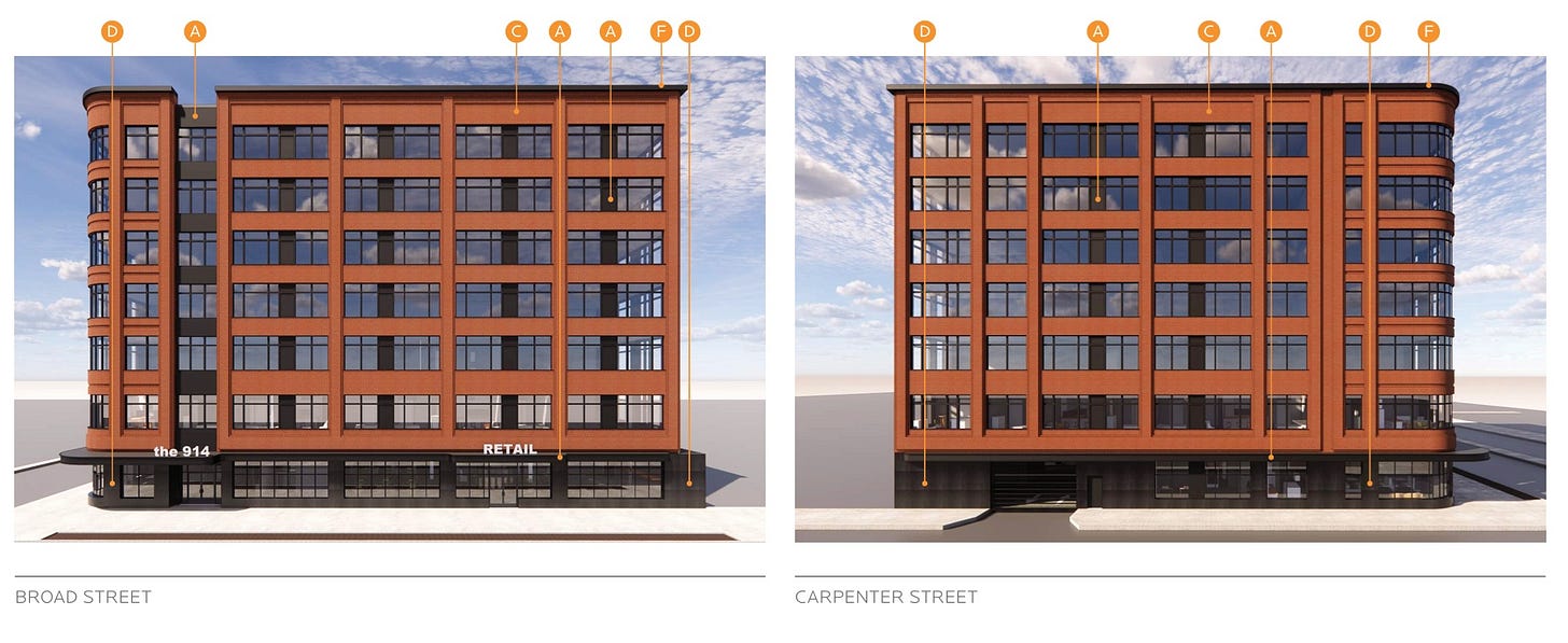 While this news mostly aligns with what we’ve known in the past, the exciting update here is a smattering of brand-new renderings. JKRP Architects has handled the design, which offers a contemporary take on the traditional theme of red brick industrial buildings that were once prevalent in the area (more on that in a bit). The corner of Broad & Carpenter is softened with a rounded curve, breaking up the more traditional materials and scale of the rest of the design. The back of the building will consist mostly of dark paneling, with large windows along every side of the structure - including close to the property lines. But enough talking, let’s check it out what looks to be called the 914.