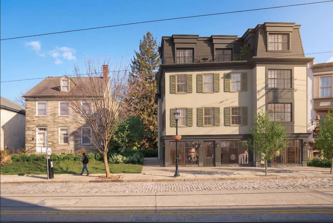 After reporting on the multi-unit project in Chestnut Hill that was set to sit astride from the Detweiler House last month, we have an update! The developers for the property, Vich Properties, reached out to let us know that this concept was given the OK to proceed at today’s Historical Commission meeting. The four-story, mixed-use building will rise on an empty lot next to the protected house, bringing a design from Morrissey that’s worthy of the location.