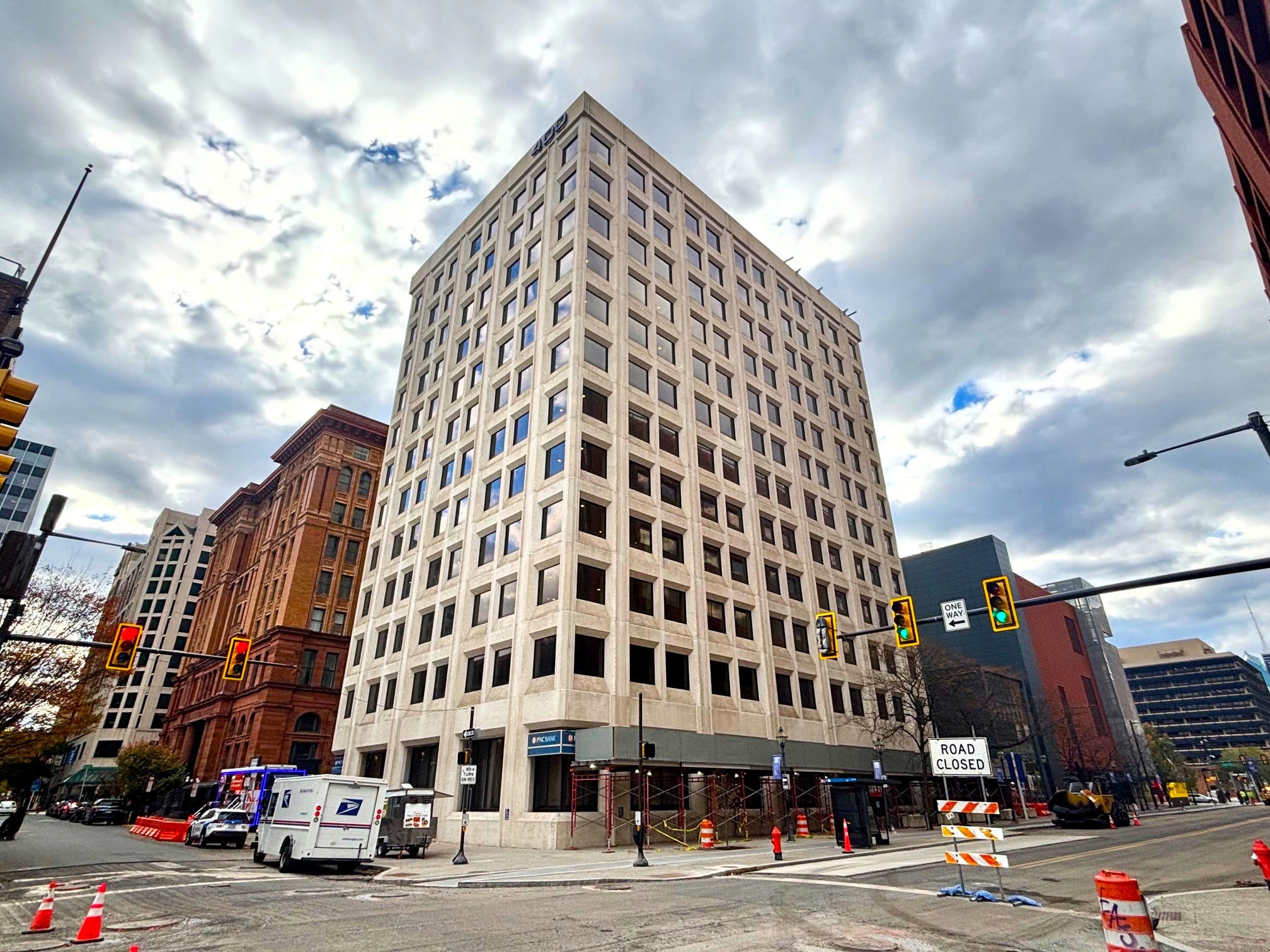 It is possible, of course, that we could see apartments here, just like we’re about to see at the building directly across the street at 400 Market. We stopped by here earlier this year to tell you about the 176 residential units that are coming to this former office building, which has since received construction permits and has new scaffolding around that base that foretells imminent construction (we hope). This influx of new residents in this narrower building is a very welcome addition to this block, which currently has a grand total of zero people. Would the red-bricked neighbor across the street want to compete with this? Who’s to say!