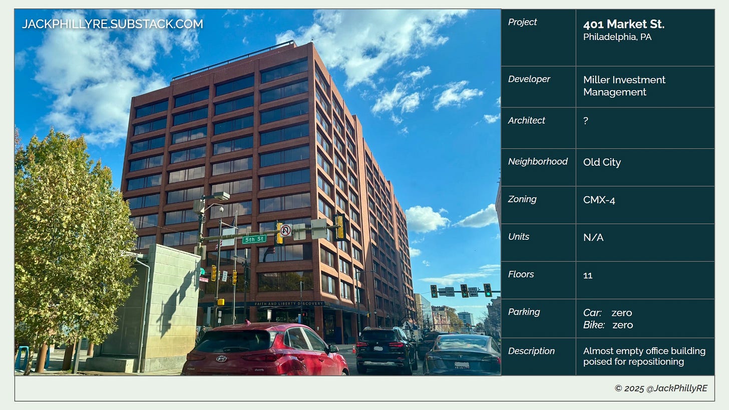 While out and about earlier today, we found ourselves at Independence Mall looking east towards 401 Market St., best known as the former home to Wells Fargo. This 11-story tower was also the former home to the Faith and Liberty Discovery Center, which was only open for a short time before closing in early 2024. These vacancies left the American Bible Society as the only office tenant and the Museum of Illusions at the southeast corner as the only ground-floor draw. The owner of the property, Miller Investment Management, just recently paid off a $56 million loan on the building, clearing the outstanding debt - and clearing way for the future.